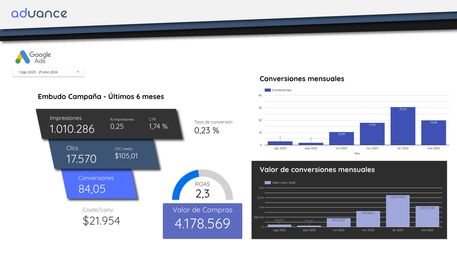ROAS promedio en los ultimos meses 2,3. Retorno de la inversion en publicidad del ultimo mes fue de 9,4